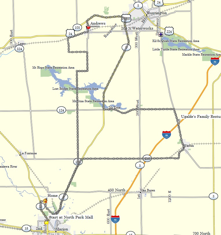 I planned on riding along the river from Andrews west to Wabash and if it didn't rain, I thought we could ride the Wabash river to Peru. I thought perhaps riding slow along the river, in the rain, would be better than out on the highway, especially under the trees. As we rode along west on IN 124 it started raining harder and harder. As we went North on IN 9 toward Huntington, it got even worse. I asked John how he was doing when we stopped at the stoplight at Huntington and he said he was ready to go home.
